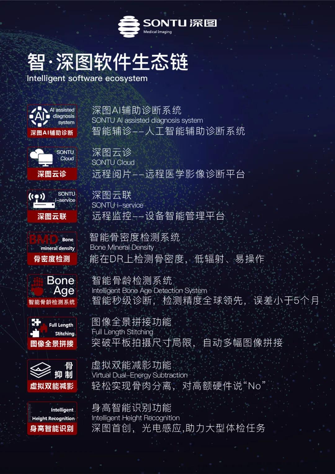 深图每一台出厂的DR设备都配备了深图AI辅助诊断系统,让诊断的精准性和便捷性进一步提高;更搭配了深图云诊、深图云联、骨密度检测系统、智能骨龄检测系统、图像全景拼接、骨抑制-虚拟双能减影、身高智能识别等丰富的高级应用功能,切实助益临床,受到入驻医疗机构的一致好评。